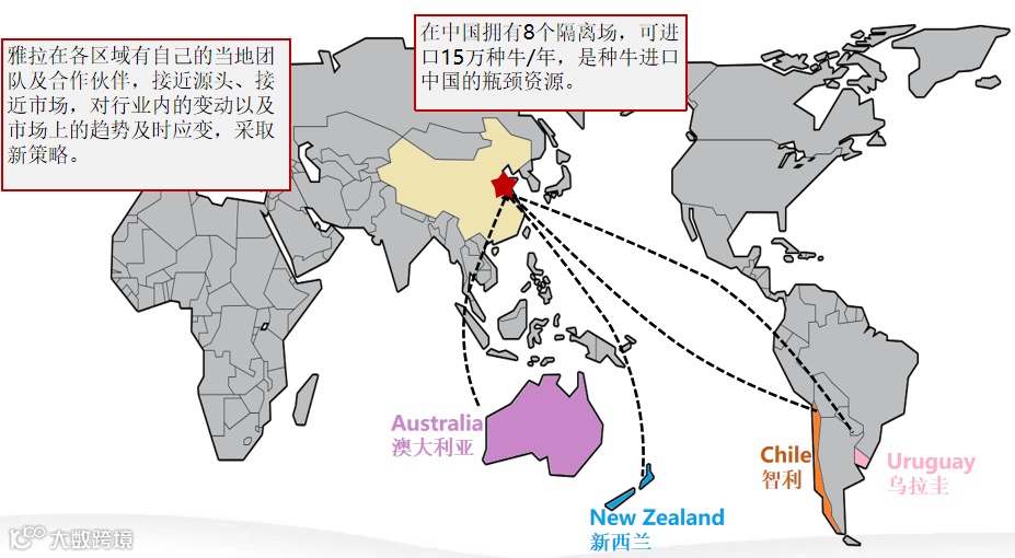 雅拉集团在中国拥有8个隔离场,分别在山东潍坊4个,河北黄骅4个,可进口15万种牛/年,解决种牛进口中国的瓶颈资源。