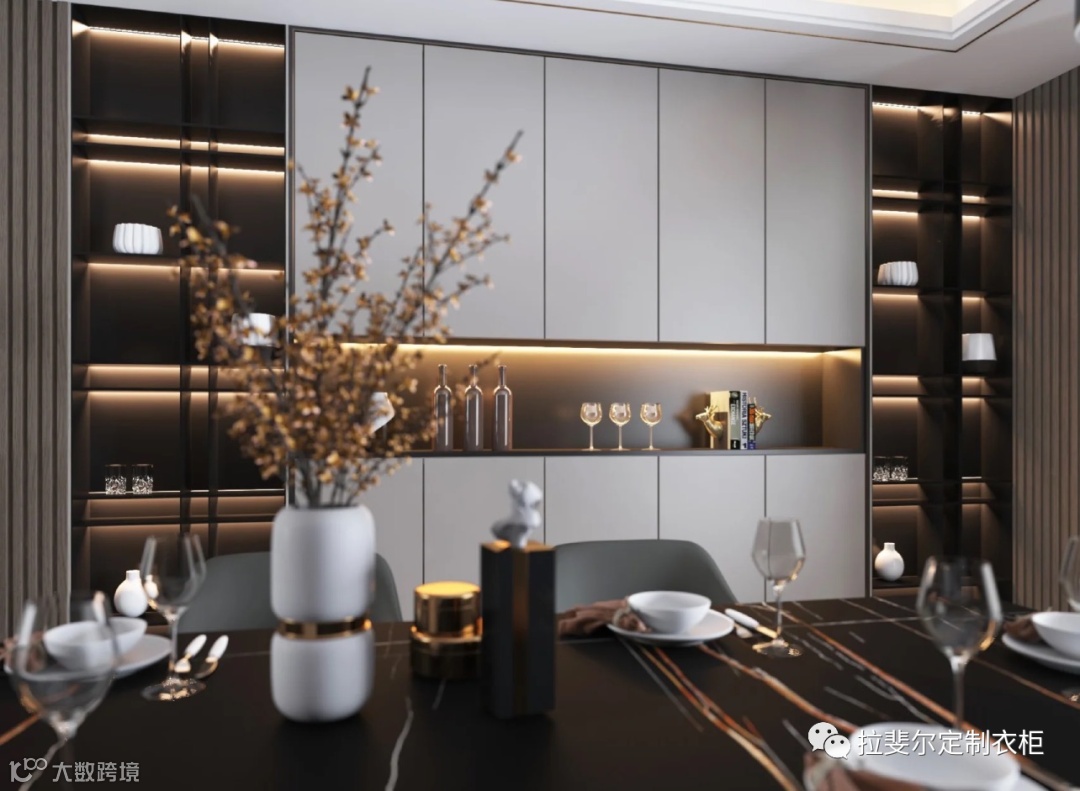 玻璃门采用喷砂黑色金属线框搭配意式白色柜体,用感应灯带灯条点缀,瞬间打破空间的压迫感。整体视觉效果让人感觉有一种低调奢华,生活变得更加精致大方。