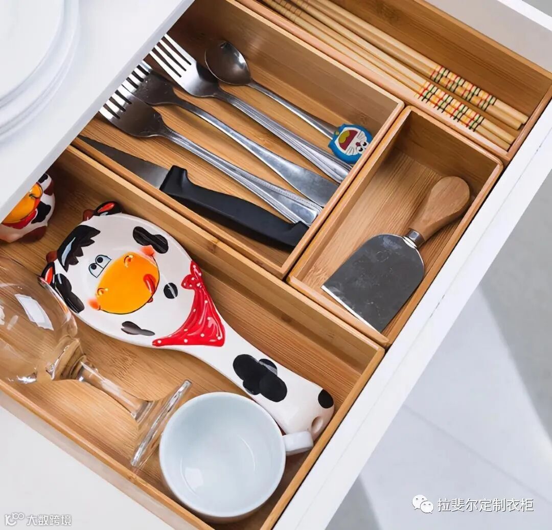 一般的抽屉用起来不太方便,里面摆放了各种各样的厨房用具看上去格外凌乱,每次拿东西的时候都需要翻找半天,不仅花时间还花精力。因此我们可以给厨房入手这款抽屉分隔板,我们将不同长度、大小的餐具分类摆放好,找的时候一目了然,随手拿取,用完后还能直接放回原处,抽屉想要变得凌乱都很困难呢!
