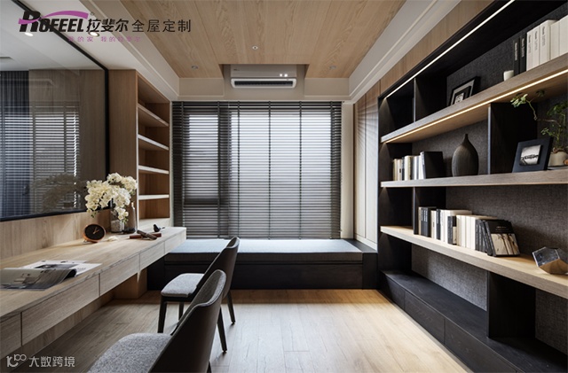 书是人类进步的阶梯,养成读书的好习惯,有助于我们学习知识,提升自我。一面设计整墙书架收纳书本,一面设计双人书桌。非常适合夫妻二人一起学习提升自我。旁边的榻榻米是休息区,