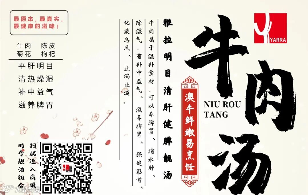 牛肉属于温补食材,可以养脾胃、消水肿、除湿气,有补中益气、滋养脾胃、强健筋骨、化痰息风、止渴止涎。Yarra澳牛鲜嫩易烹饪,做汤、做羹、做粥都非常方便。