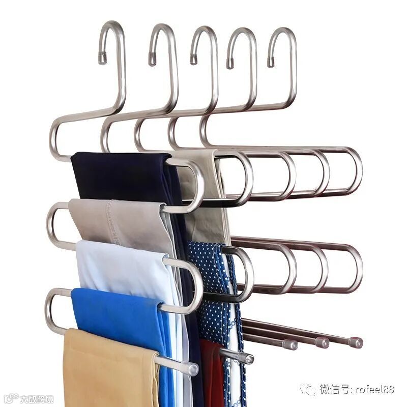 裤子不要堆叠摆放,拿的时候很容易被弄乱,所以要挂起来,可以选择S型的裤子专用衣架。