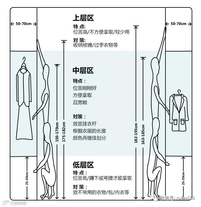 根据衣物的使用频率,收纳物品重量和人体工程学,我们将衣柜分为三个不同的区域,分为上层区、中层区、下层区。