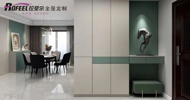 暖灰色+灰绿色组合的优雅大玄关柜,在树脂装饰物和柔和射灯照射下,空间像美术馆一样安静而美丽。底下的换鞋凳,方便主人进出换鞋。