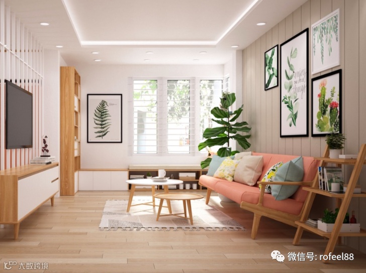 原木地面、原木色茶几、原木色电视柜、有种偏日式风的感觉。原木的运用,为整个空间增加了温暖的气息。