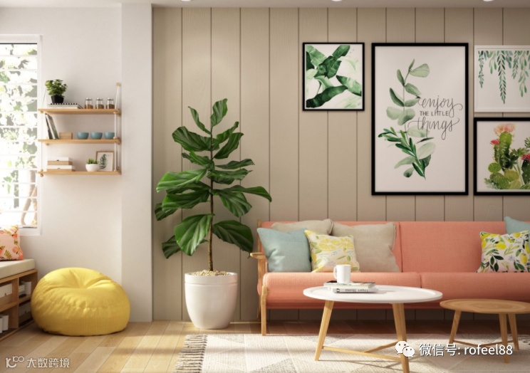 客厅的色彩搭配丰富,橙色的沙发、绿色的盆栽、清新文艺的挂画、黄色的懒人沙发,明亮缤纷的色系看上去令人心旷神怡。