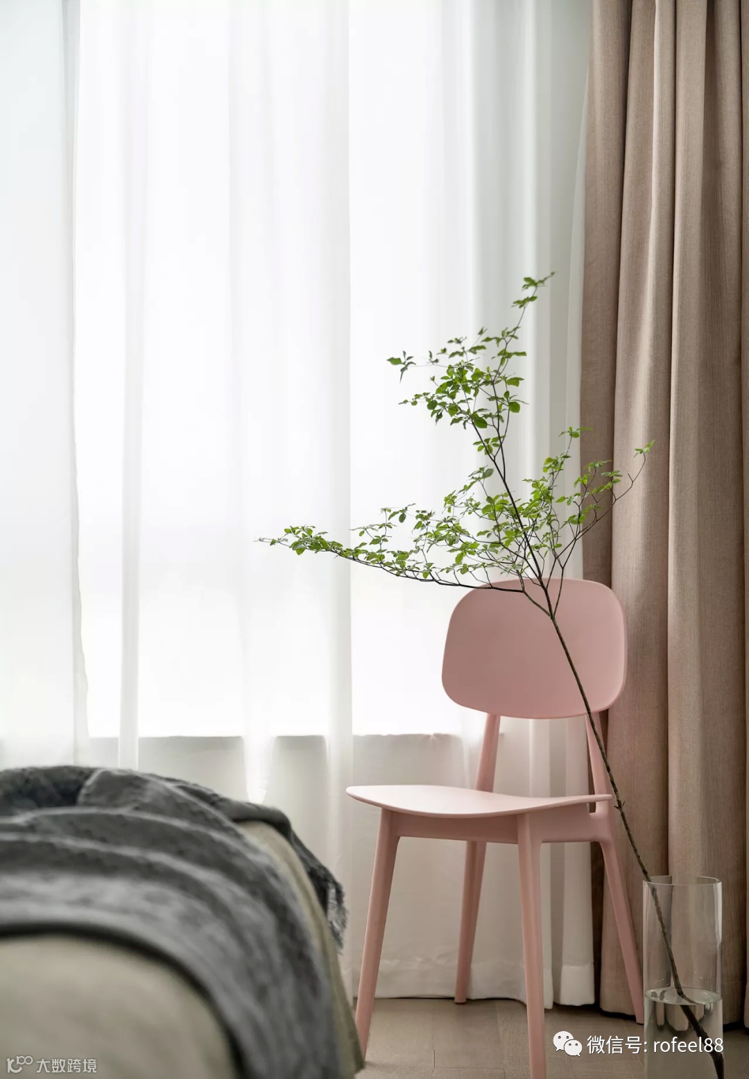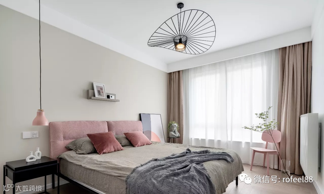 灰色和粉色成为了卧室的主打色彩,色彩的巧妙运用把莫兰迪色系的舒适感展示的淋漓尽致,造就静止的温情时光。