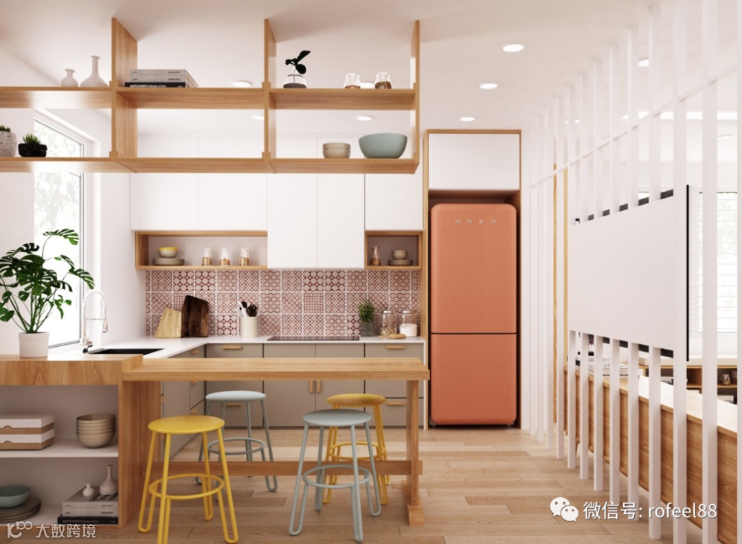 板条电视背景墙将客厅与厨房隔开,空间显得更大,没有局促感。开放式厨房、木质置物架及吧台,简洁的设计美观实用。珊瑚色冰箱与沙发相呼应,黄色和薄荷色凳子点亮了吧台区,整个空间色彩丰富但不过于花哨。