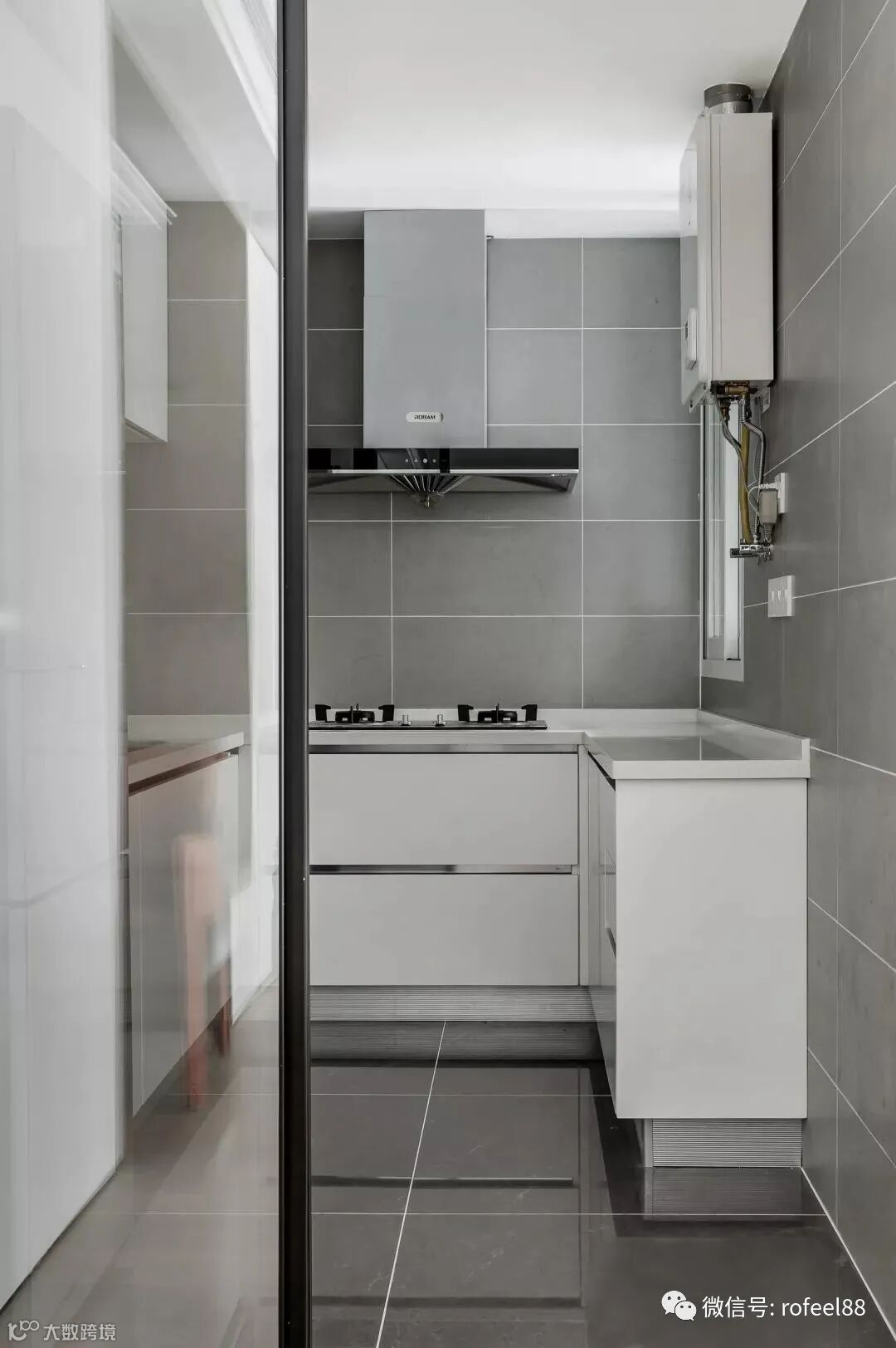 在黑框玻璃推门背后,是U形格局的厨房,亮灰色地面+亚光灰墙面,在白色橱柜的搭配下,小厨房显得实用而时尚大气。