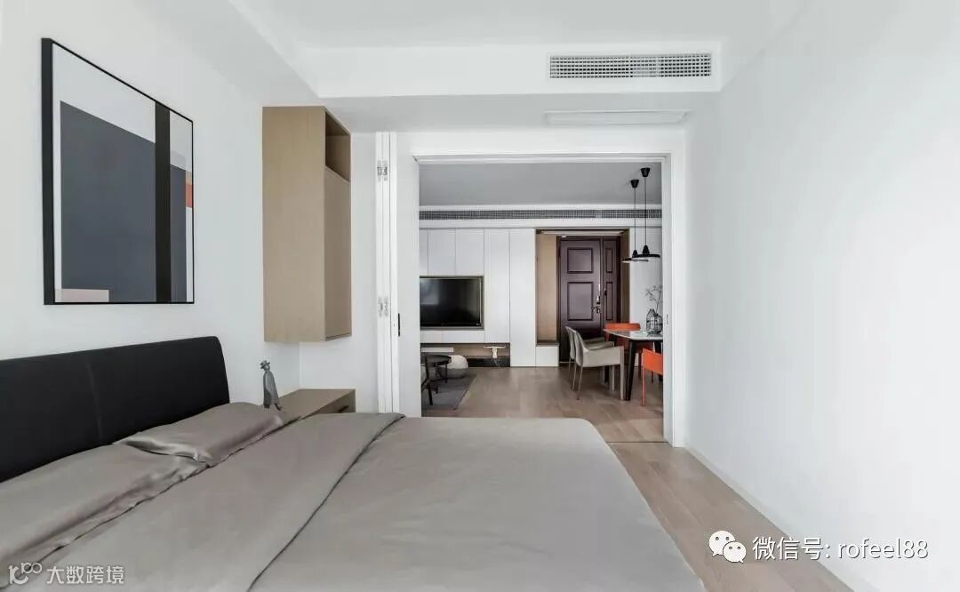 卧室的房门非常大,折叠门的使用使卧室能更好的通风和采光,同时也显得更宽敞。卧室现代时尚的搭配,简洁空间搭配上轻奢成熟的软装布置,令人感到轻松闲适。