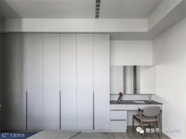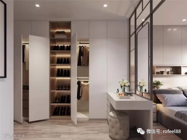 梳妆台与衣柜结合,不仅有效利用空间,还能让空间更具整体性,又能满足我们的各种需求,是十分便捷的设计。轻奢系衣柜与梳妆台搭配,淡雅清爽的颜色让人印象深刻,也是整个房间的亮点所在。