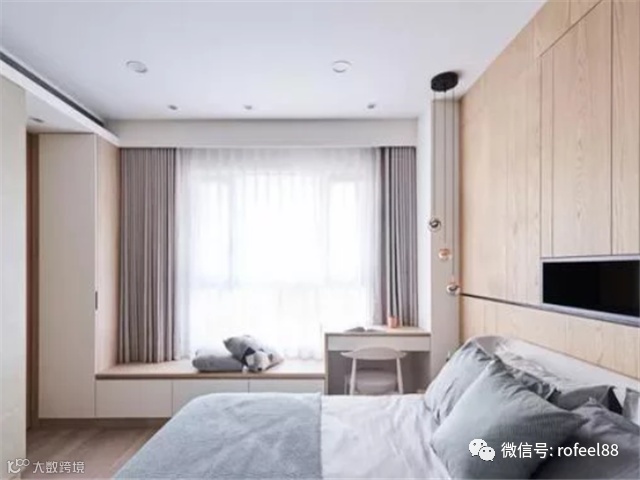 将角落的空间利用起来,把梳妆台桌面延伸至床头侧上,这样不会破坏空间的完整性和美感。台面放置常用的化妆品,不常用的放抽屉,轻松分类放。起床就可以画个美美的妆容!