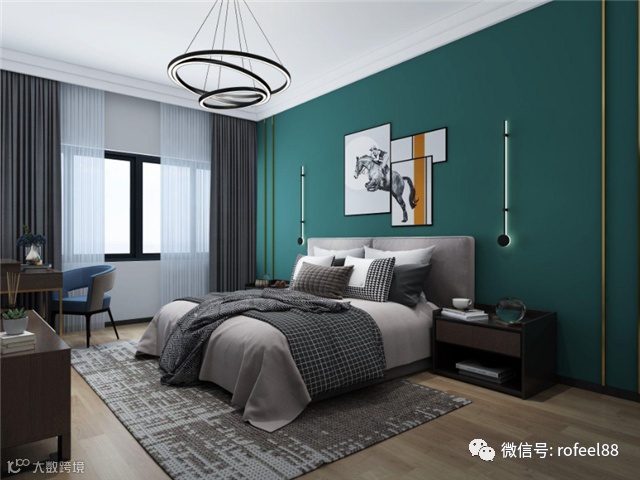 主卧背景刷墨绿色墙漆,在三幅拼接画和壁灯的点缀下,更加凸显现代气息。顶部不规则吊灯组合形式打破常规,提升层次。实木地板下垫上一张毯子,与床上用品颜色呼应,很协调。靠窗的一边还有书桌,满足屋主的阅读需求。