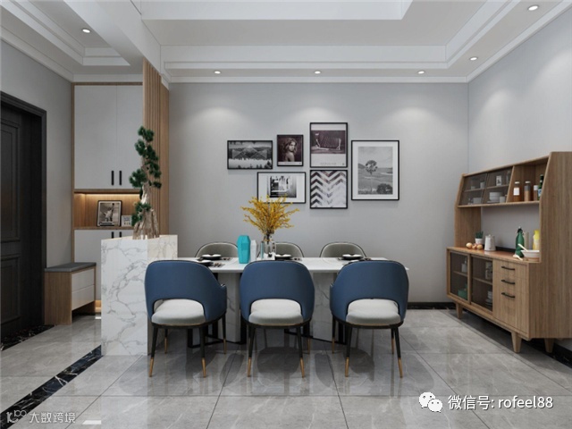 厨房出来就是餐厅,白色的餐桌搭配宝蓝色的餐椅,桌面放一束黄色的花点缀,格外漂亮。旁边还有一个原木色餐边柜,存放多余的碗筷、调料、酒水,客人来了就从里面拿出来用。墙面挂几幅挂画,让墙面不那么单调。