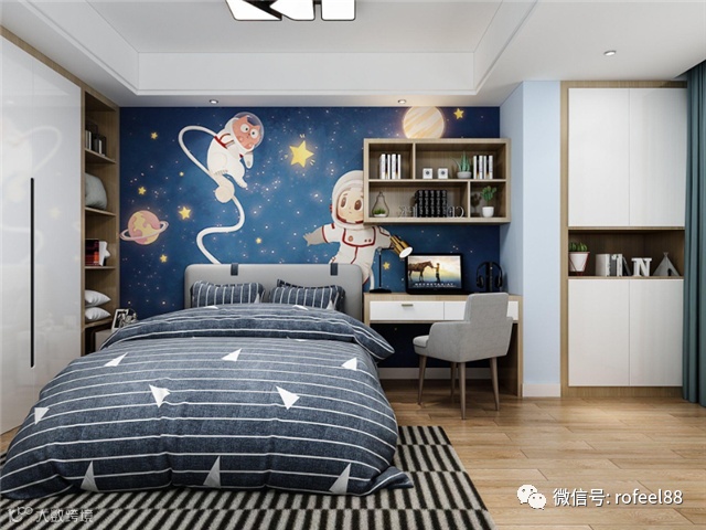 这是一间儿童房。背景绘制了宝宝喜爱的动画图像,床头摒弃床头柜定制书桌和书架,在家不用担心孩子没地方写作业。床头另一侧定制到顶衣柜,孩子从小住到大衣服都够放。蓝色几何图形的床上用品与背景颜色协调,很搭配。