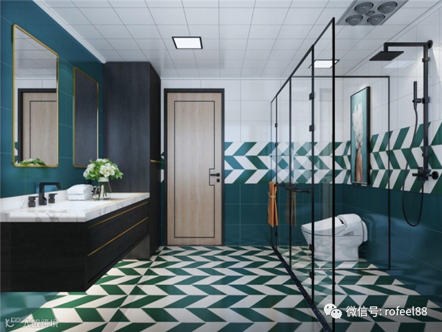 最后带大家看看浴室,浴室很大,黑、白、绿是主色调。绿白色的瓷砖视觉上增大浴室面积,宽大的洗手台,夫妻二人一同使用也不拥挤。旁边定制到顶储物柜,用于存放各种各样的浴室用品。