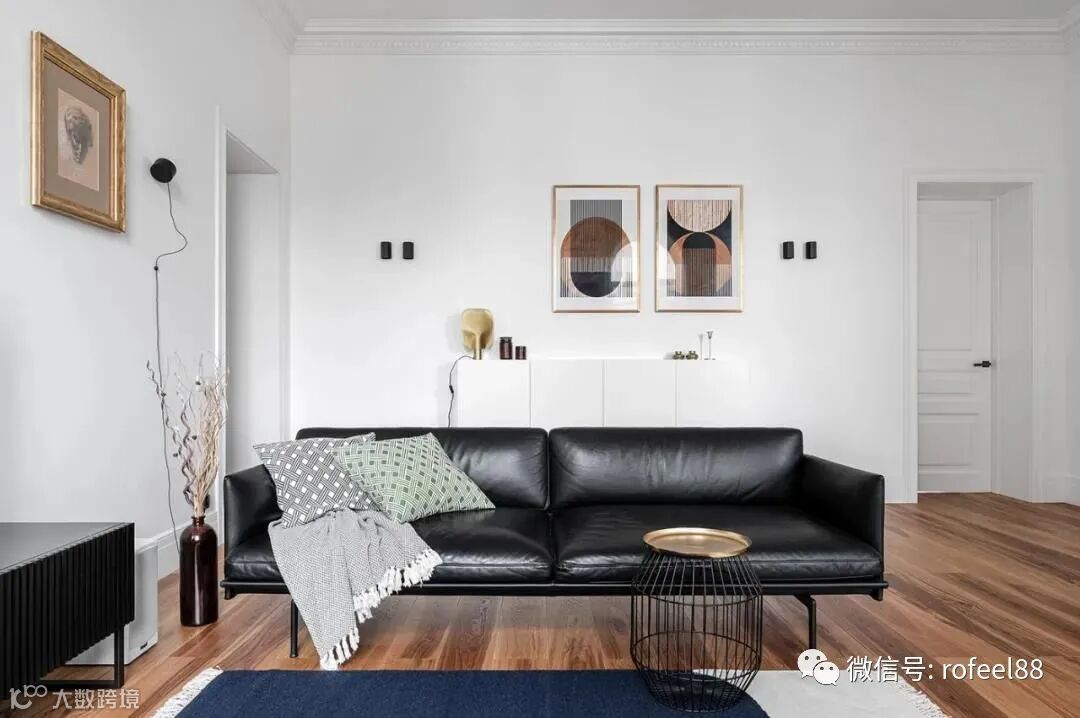 硬装简洁朴素,非常符合屋主的喜好。黑色皮革沙发搭配浅灰单人沙发,围合成灵活的会客区,更利于交流互动。迷你的茶几是客厅的亮点,轻盈美观。