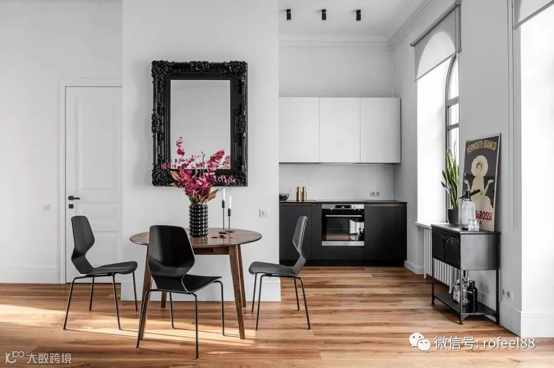 型小橱柜,柜体延续黑白配色,嵌入蒸烤箱,能满足屋主日常备餐。