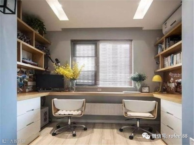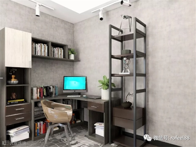 对于面积小的房间,可以利用转角空间设计书柜。转角书柜与书桌相连,办公阅读两不误。最大的优势就是能和房间的其他家具结合在一起,最大限度地节省空间。