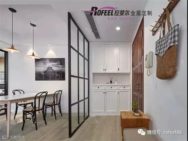 2.进门是餐厅且面积比较大的,还可以在靠一面墙的位置做一排鞋柜,与墙面垂直,另一面还可以用来做成餐边柜,将鞋柜和餐边柜合为一体也是个不错的选择,非常实用。不过要注意将鞋子收纳好,不然容易有味儿。