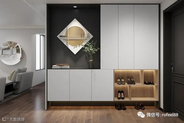 入户的玄关鞋柜,底层留空放常穿的鞋,上方是分层的鞋柜和收纳空间,置顶的收纳柜看起来很大气。线条和空间感流畅,适合收纳日常物品。上方还留有一部分的展示墙,放上一盆绿色植物,起到了很好的装饰效果,提升整体颜值。