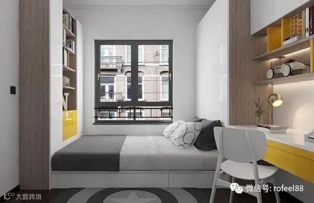 原木柜体搭配鹭白门板辅以正黄色点缀空间。床尾的展柜与抽屉,提供了丰富的储物空间。这样的儿童房设计让孩子有了属于自己的独立新天地,兼顾休闲、学习、休息、储物。多功能一体化的设计,可谓相当巧妙。