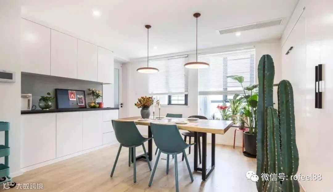 餐桌椅摆放在正中间,左右两侧都是储物柜,收纳空间充足。四周也摆放了绿植,更显更加自然清新。