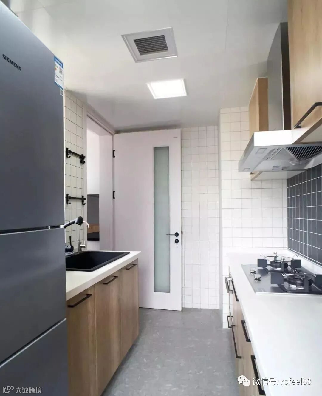 厨房采用白色小方砖铺贴,整体颜值更高。为了更好的利用空间,做了双一字型的橱柜布局,冰箱也有了安放之处。