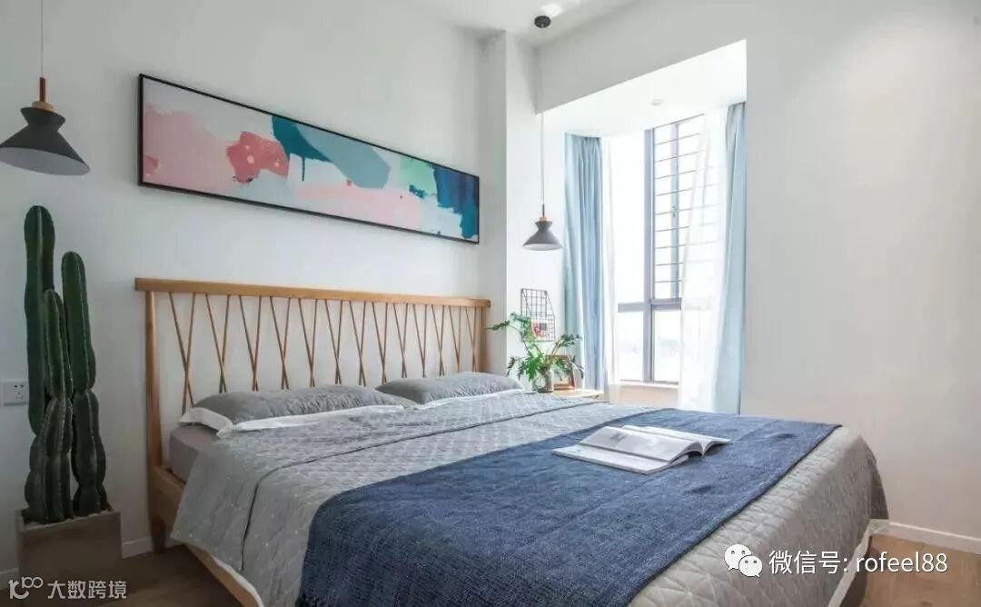 主卧室的空间比较大,大面积留白的设计搭配简洁的床品,旁边还摆放了一盆大仙人掌,给人清新自然的感觉,