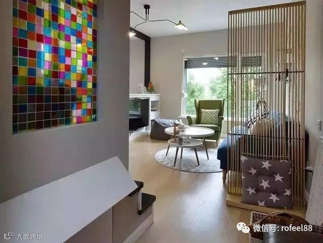 玄关处以马赛克彩绘玻璃作为隔断,色彩绚丽,又增加了空间的采光与通透性。