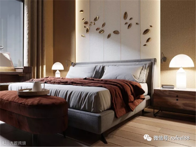 极简舒适的卧室,背景墙设计别具一格,摆上舒适的床铺,辅以低调有质感的配色,采用清新的床头灯和地板,打造出温暖的大地色调。床头板上饰有金色装饰,温暖地反射灯光。床上用品的色调与床尾凳完美匹配。打造出一个低调但富有精致的卧室空间。