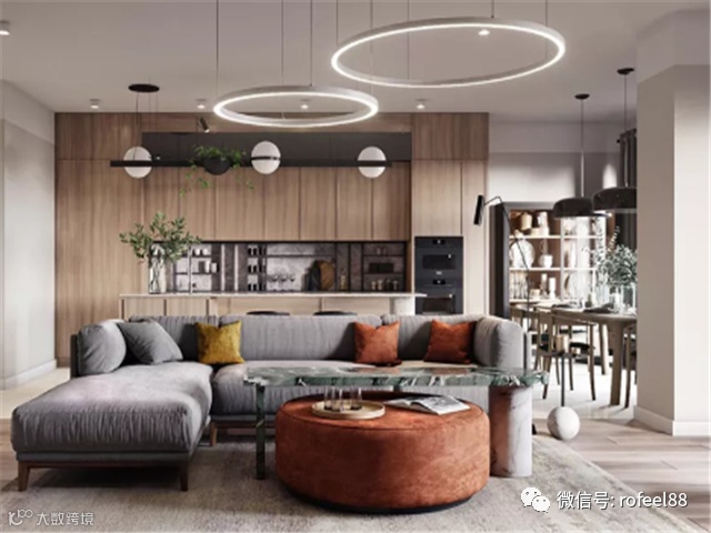 L型的灰色现代沙发与大理石咖啡桌搭配,下方是颜色鲜明的橙棕色圆形桌,与长大理石咖啡桌重叠。黑色电视柜简约时尚,电视采用壁挂方式。侧面木格栅式的高柜,配合一组上方吊柜为较大的物品提供存储空间。