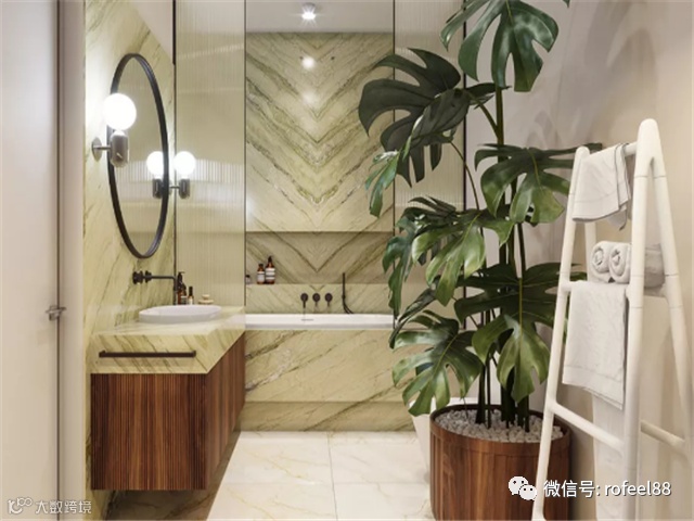 浴室的米色地砖和山形纹路的大理石搭配营造出奢华的感觉。洗手台上方的大圆镜两边配上洁白的灯,明亮清晰。地上摆放一盆绿色植物,给室内带来一丝生机。