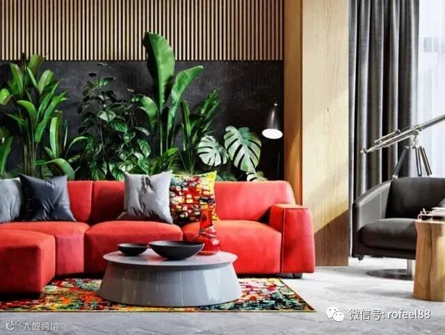 拉斐尔全屋定制来给大家讲讲,我们再来看看客厅在颜色搭配上的巧妙运用吧!可以看见客厅采用的混搭,红色的沙发搭配上背后的绿植,感觉整个客厅春意盎然。