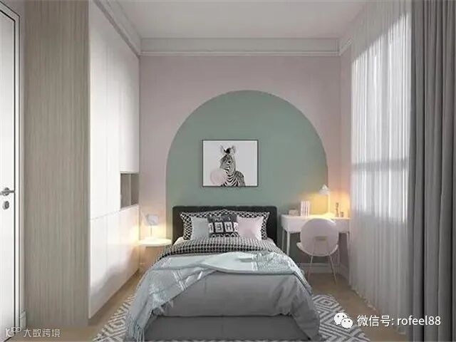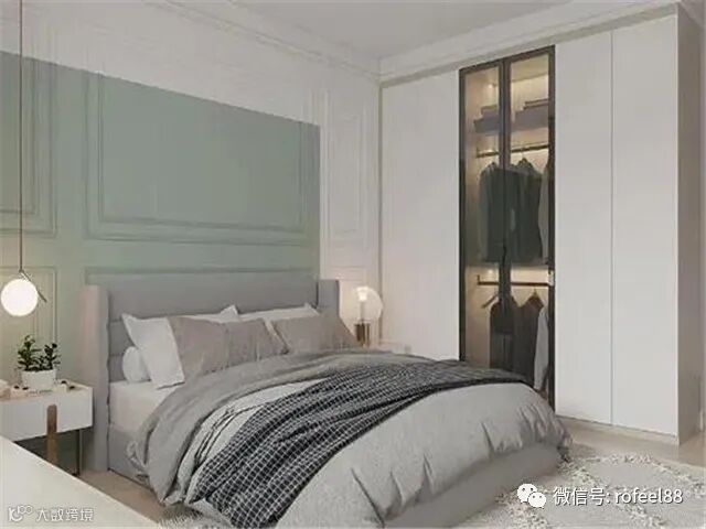 主卧衣柜采用嵌入式的设计,无门把的柜门让空间显得十分简洁利落,富有格调的玻璃掩门设计。在LED灯照射下增添了几分浪漫。白色与薄荷绿搭配有小清新的感觉。