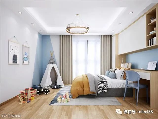 另外,床头柜、书桌、衣柜的一体化设计,实用性杠杠的,还能留出床尾空间给孩子打造
