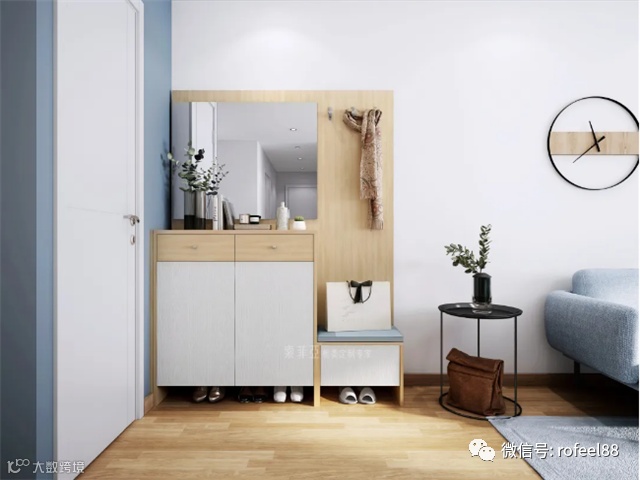 一进门靠墙做了一个收纳鞋柜,上下分段设计,满足全家人鞋子的收纳需求。鞋柜功能十分完备,收纳展示、挂衣储物面面俱到,挂衣区、装饰镜、换鞋凳一应俱全。