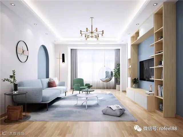 客厅采用实木地板,运用大量白色,与局部蓝色搭配,给人一种清新自然的感觉!客厅和阳台打通,给客厅带来了充足的光线与通透感,使空间整体轻盈有活力。配上阳台的亚克力吊椅,整个空间意趣盎然。电视背景设计开放式储物格搭配掩门收纳,能藏能露,非常实用!