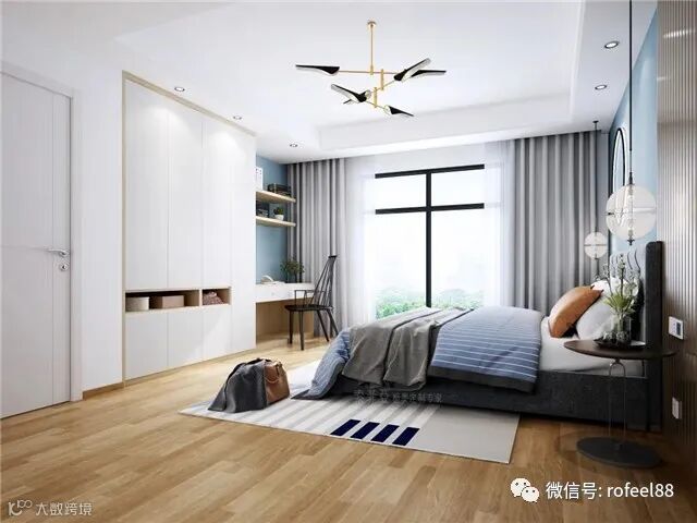 卧室没有过多的装饰,追求精益求精的细节以及舒适性。整体以白为主,蓝色为辅。通过饰品的点缀,显得整个空间浪漫、高雅而又不失内敛。墙漆的蓝色、柜体的白色、地板的原木色,一同营造出了色彩轻柔的主卧空间。床尾柜采用大面积的羽白栓木打造柜门,就算顶天立地也不压抑。和衣柜一体化的书桌设计,将原本鸡肋的角落空间也利用起来了,谁敢说它不实用?