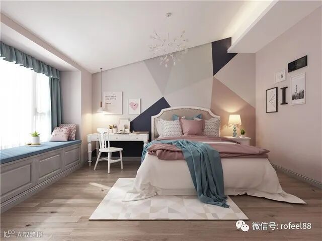 当女儿18岁成年以后,女儿的审美已然发生变化,低龄化设计已不再符合她的要求,她更喜欢时尚的设计。上图这间公主房给人眼前一亮的感觉。实木地板时尚简约,蓝色的窗帘下铺上一张垫子,休闲时刻可以坐在上面欣赏窗外的风景。几何背景墙是整个房间的点睛之笔,看起来十分唯美。