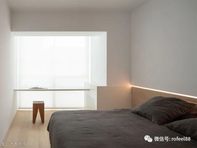 拉斐尔家具来给大家讲讲,卧室轮廓重点在于窗边,窗户边上用简单的搭板做了一个可供办公、阅读的区域,使窗边线条格外清晰,整个卧室空间散发出宁静安详的气息。
