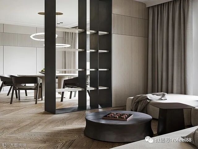 客厅与厨房是运用实木镂空隔断,保证整体的通透采光,无形中也解决了客厅空间感不足的问题。黑色木隔断和茶几以及餐椅的颜色一致,让空间无形中连接起来,隔而不断,浑然一体。