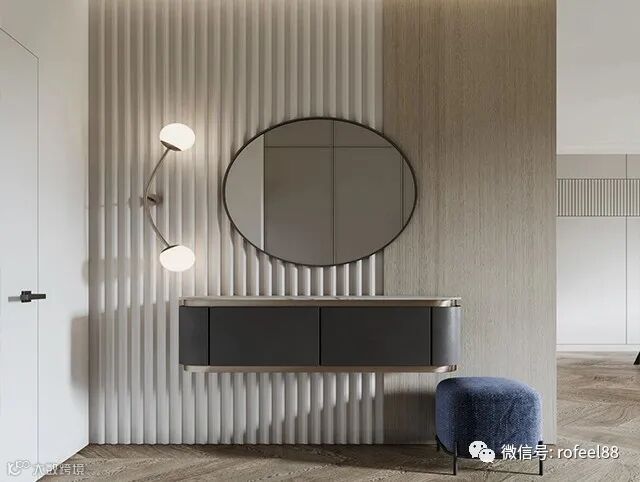 进门玄关就极有特色,进门玄关墙面的线条尺寸很大,呈现水波纹状,设计的镜子和悬挂式的装饰柜,线条柔和优美和硬朗的墙体形成反差感,设计的非常有特色。壁灯与换鞋凳,看的出也是精心挑选,质感十足。