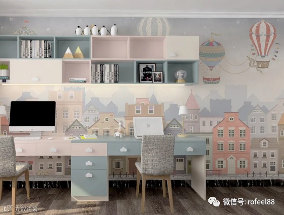 在床的对面设计双人书桌,俩娃一起学习,家长在一旁辅导,学习成绩差不了。五彩缤纷的墙面搭配粉嫩色系的书柜和桌椅,让整个儿童房充满童趣。