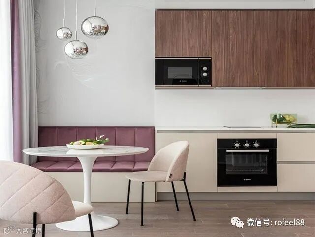 穿过玄关右手边是厨房和餐厅,厨房的面积相对宽敞一些,餐厅的面积相对小一些,不过厨房和餐厅之间没有隔断,空间共享,就不会觉得单独的区域憋闷压抑了!餐厅是卡座设计,可以减少餐椅的占地面积。更节约空间。