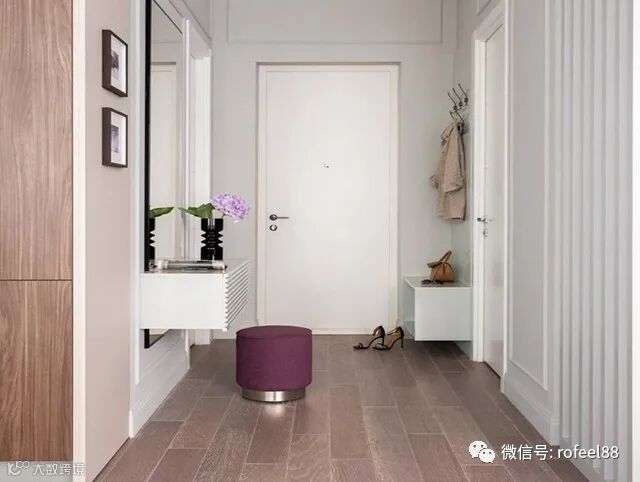 进户玄关的空间非常宽敞,因为衣帽间就在玄关的左手边,所以玄关处并没有设计玄关收纳柜,只在靠近进户门的位置,安装了一个壁挂式的鞋柜。简易衣架挂放常穿的外套!
