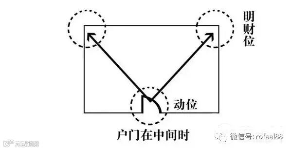 如果住宅门开在左边,财位就是在右边对角线顶端上,如果住宅门开在右边,财位就在左边对角线顶端上,如果住宅门开在中间,财位就在左右对角线顶端上。