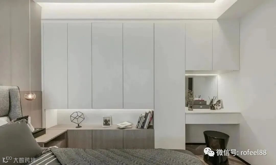 主卧背景墙做了灰色软包与木饰面,增加空间的层次感,视觉上空间显大。一侧打造了到顶大衣柜,一角设计梳妆台,充分利用空间,衣柜的下方空间设计与床头柜相连,中间留空满足不同的收纳需求,摆件提升室内情调。