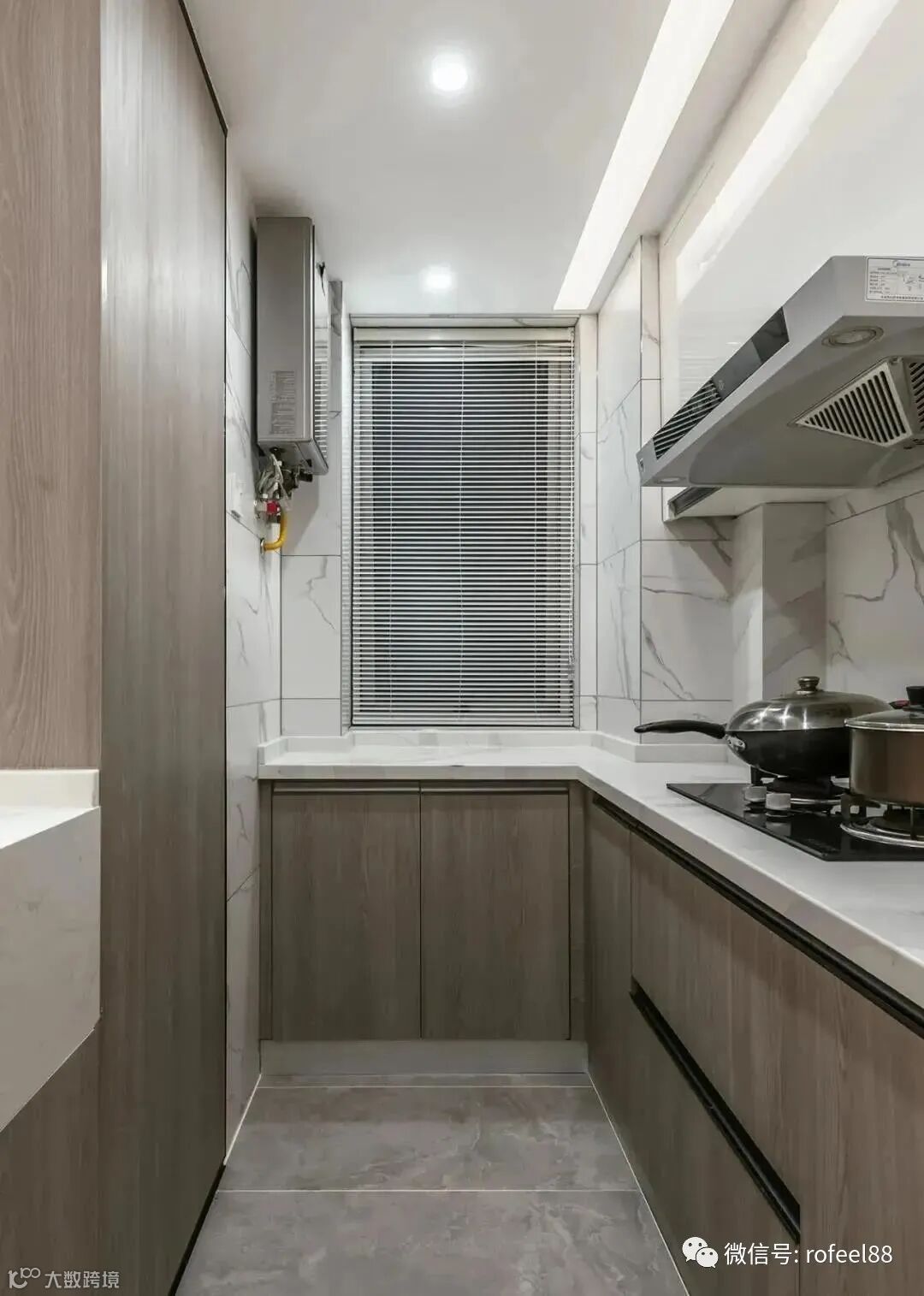 L型厨房设计,大大提高了空间利用率。木色橱柜搭配白色吊柜,视觉极简清爽,底部的橱柜和顶部的吊柜结合,让厨房有足够的储物空间。