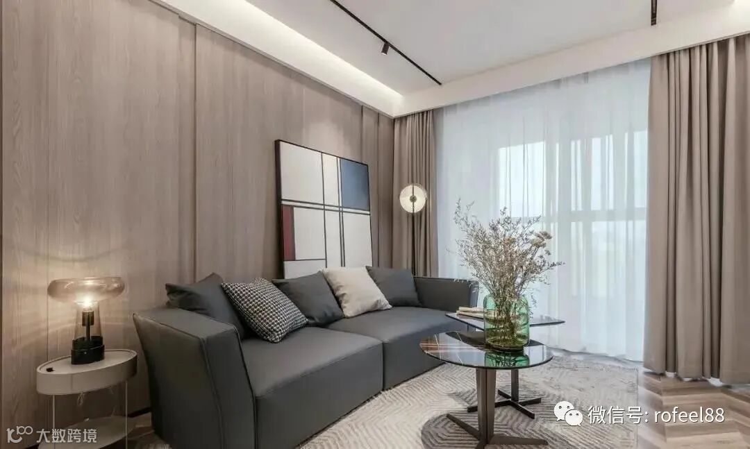 居室整体风格选择了现代简约风,空间看起来干净利落,两条平行轨道灯简单富有线条感,非常个性。用窗纱将客厅和阳台分隔开,阳台作为休闲区使用。窗纱的使用恰到好处,白天室内光线充足,同时阻挡了部分阳光,不那么刺眼。沙发背景墙做木饰面装饰,搭配非常具有设计感的沙发,配合一幅简洁的装饰画,整个空间更显简洁大气。